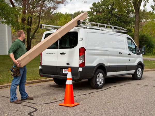 Safely load and unload long or bulky cargo from the back of your work van with ease, using AluRack’s built-in rear roller.