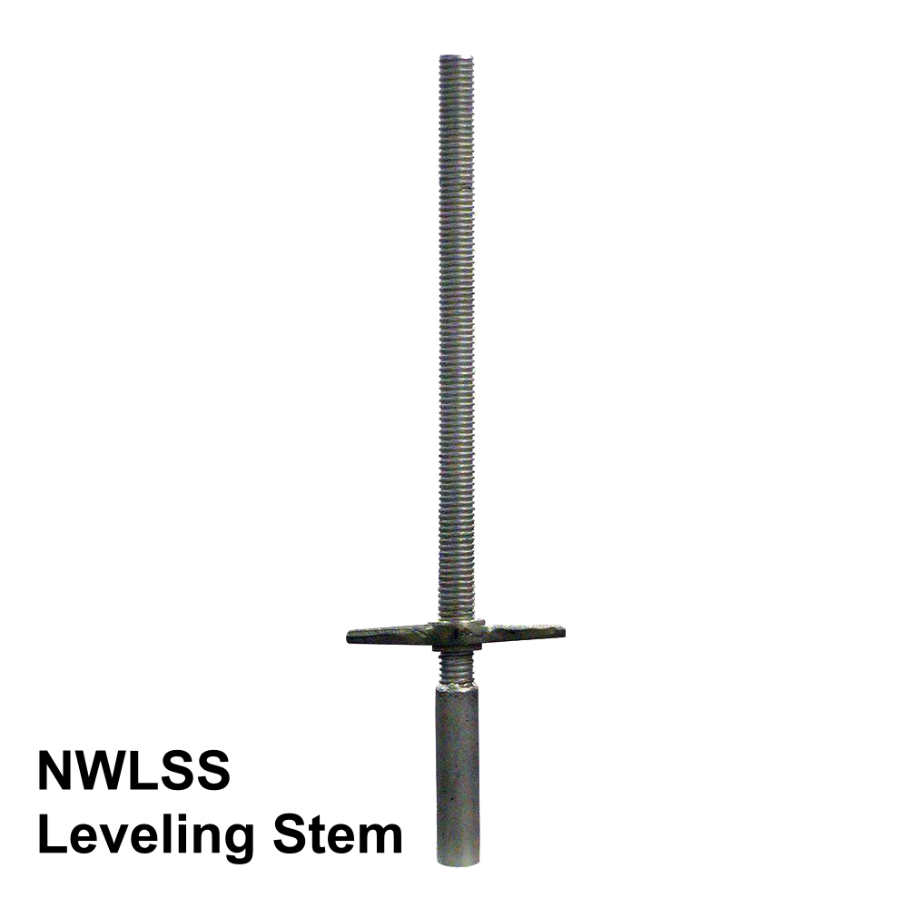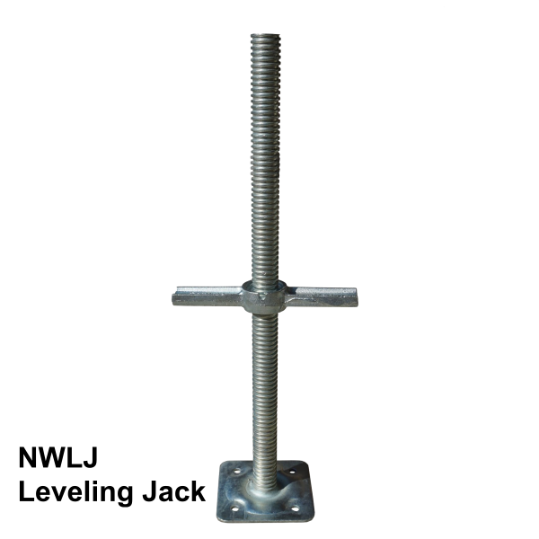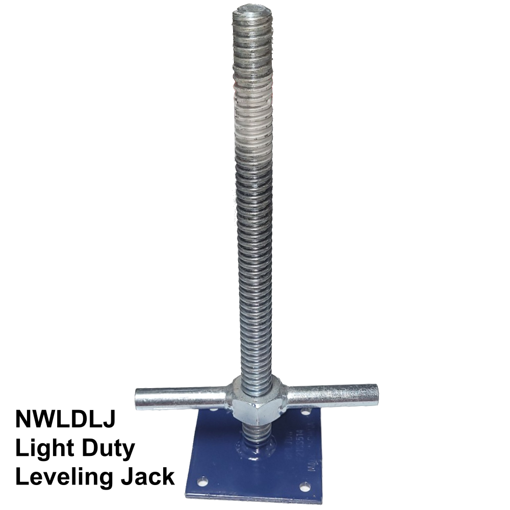 Leveling jack with base plate attached, to level scaffolding on uneven surfaces. Standard leveling jacks are 24” in height light duty are 12” in height. Swivel leveling jacks provide footing for frame assembly on uneven and angled surfaces.
